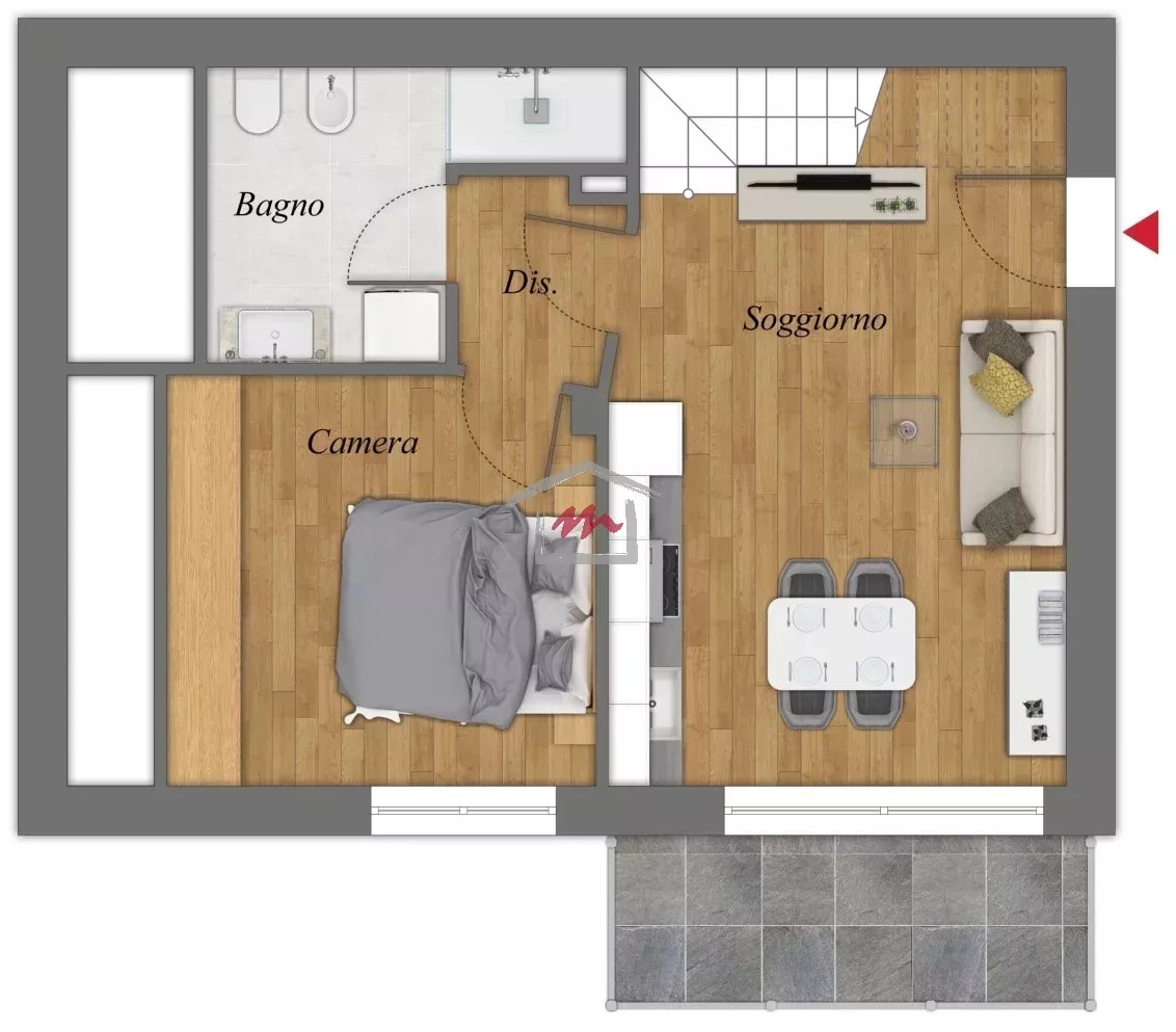 L'abitazione n. 8, al piano terra lato monte, sarà composta dal soggiorno con angolo cottura e balcone, disimpegno che conduce alla camera e al servizio. Al piano superiore mansarda con balcone.